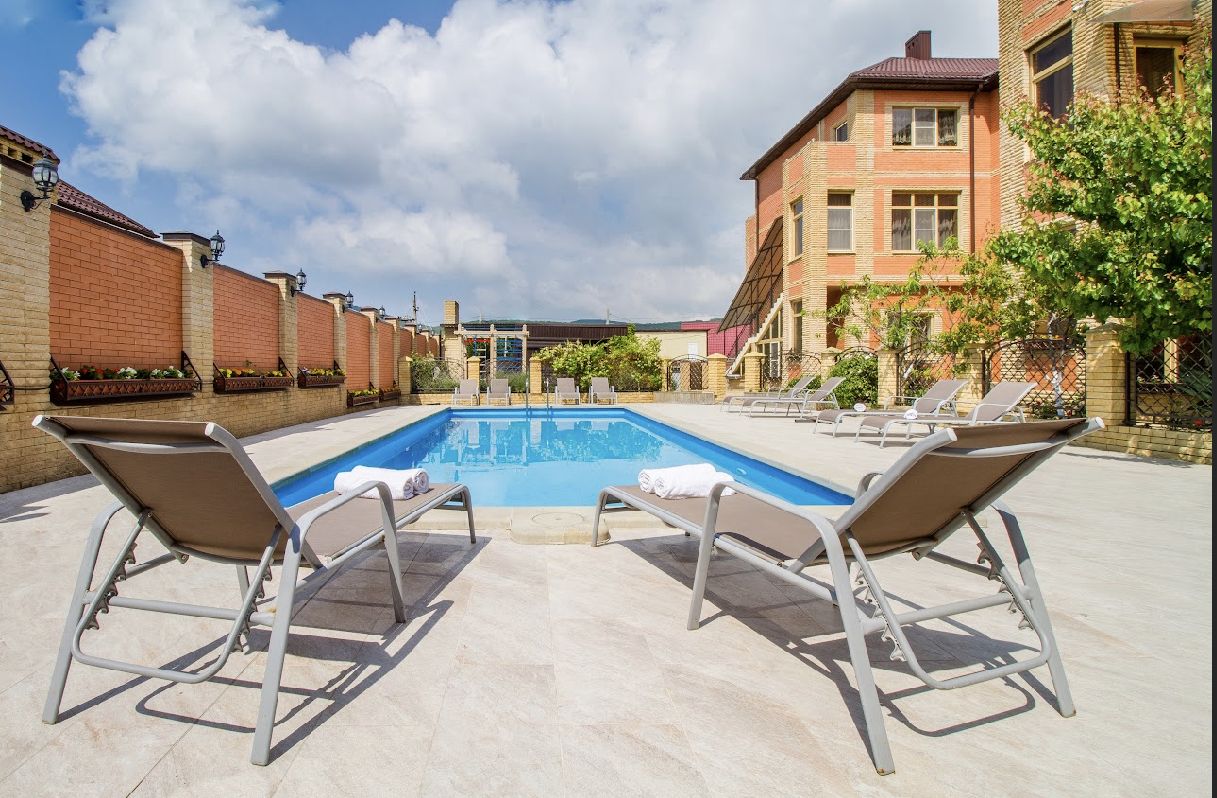 - Большой открытый бассейн с зоной отдыха и возможностью аренды инвентаря